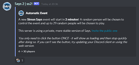 Easily play Simon Says with your server members for free using the Says Discord bot - the original Simon Says bot.